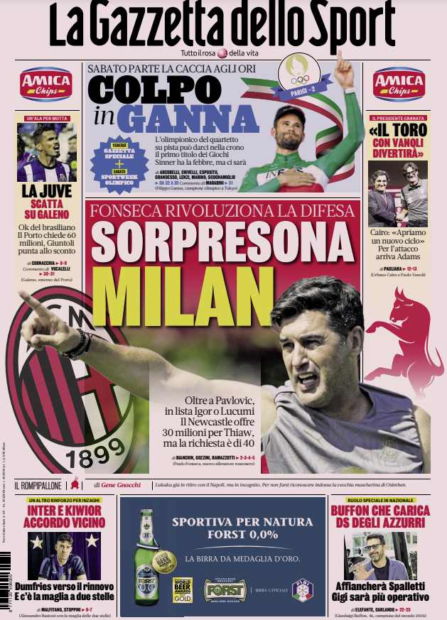 Prime pagine Prima pagina Gazzetta dello Sport: “Sorpresona Milan” Segui Ilovepalermocalcio su Google News Redazione Ilovepalermocalcio Luglio 24, 2024 L’edizione odierna de La Gazzetta dello Sport dedica un titolo in prima pagina al mercato del Milan. Continue Reading Previous Prima pagina Corriere dello Sport: “Il Palermo abbraccia Pierozzi”Next Prima pagina Tuttosport: “Douglas e Thuram ringhiamo già”