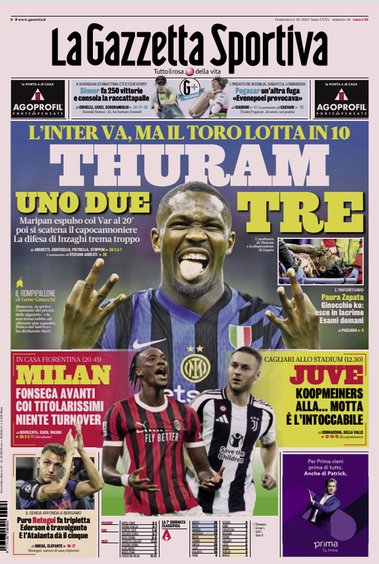 Prima pagina Gazzetta dello Sport: “Thuram, uno, due e tre””