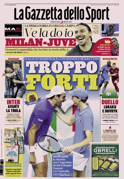 Prime pagine Prima pagina Gazzetta dello Sport: “Troppo forti” Segui Ilovepalermocalcio su Google News Redazione Ilovepalermocalcio Novembre 22, 2024 L’edizione odierna de “La Gazzetta dello Sport” dedica un titolo in prima pagina al tennis e a Berrettini-Sinner. Continue Reading Previous Prima pagina Corriere dello Sport: “Palermo, al Barbera due partite per la svolta “Next Prima pagina Tuttosport: “Yildiz, vali solo mezzo Leao?”