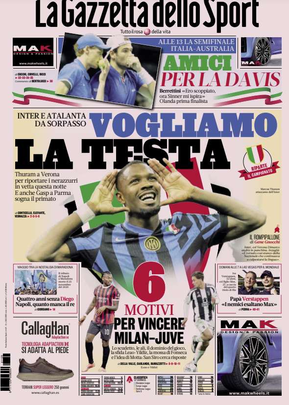 Prime pagine Prima pagina Gazzetta dello Sport: “Vogliamo la testa” Segui Ilovepalermocalcio su Google News Redazione Ilovepalermocalcio Novembre 23, 2024 L’edizione odierna de La Gazzetta dello Sport dedica un titolo in prima pagina alla sfida tra Inter e Atalanta. Continue Reading Previous Prima pagina Corriere dello Sport: “Palermo, il derby speciale di Verre”Next Prima pagina Tuttosport: “Milan e Vlahovic, Motta alza il tiro”