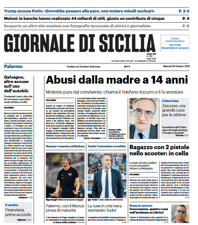 Prime pagine Prima pagina Giornale di Sicilia: “Abusi dalla madre a 14 anni” Segui Ilovepalermocalcio su Google News Redazione Ilovepalermocalcio Ottobre 28, 2025 Molestie pure dal convivente: chiama il Telefono Azzurro e li fa arrestare Continue Reading Previous Prima pagina Gazzetta dello Sport: “Avanti Spalletti”Next Prima pagina Corriere dello Sport: “La Juve a Lucio”