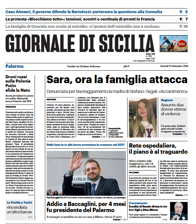 Prime pagine Prima pagina Giornale di Sicilia: “Addio a Baccaglini, per 4 mesi fu presidente del Palermo” Segui Ilovepalermocalcio su Google News Redazione Ilovepalermocalcio Settembre 11, 2025 Droni russi sulla Polonia Putin sfida la Nato Continue Reading Previous Prima pagina Repubblica Palermo: “Gli abusi in camice bianco”Next Prima pagina Tuttosport: “Toro, un’altra marcia contro Cairo”