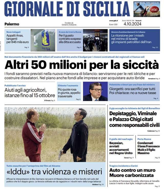 Prima pagina Giornale di Sicilia: “Altri 50 milioni per la siccità”