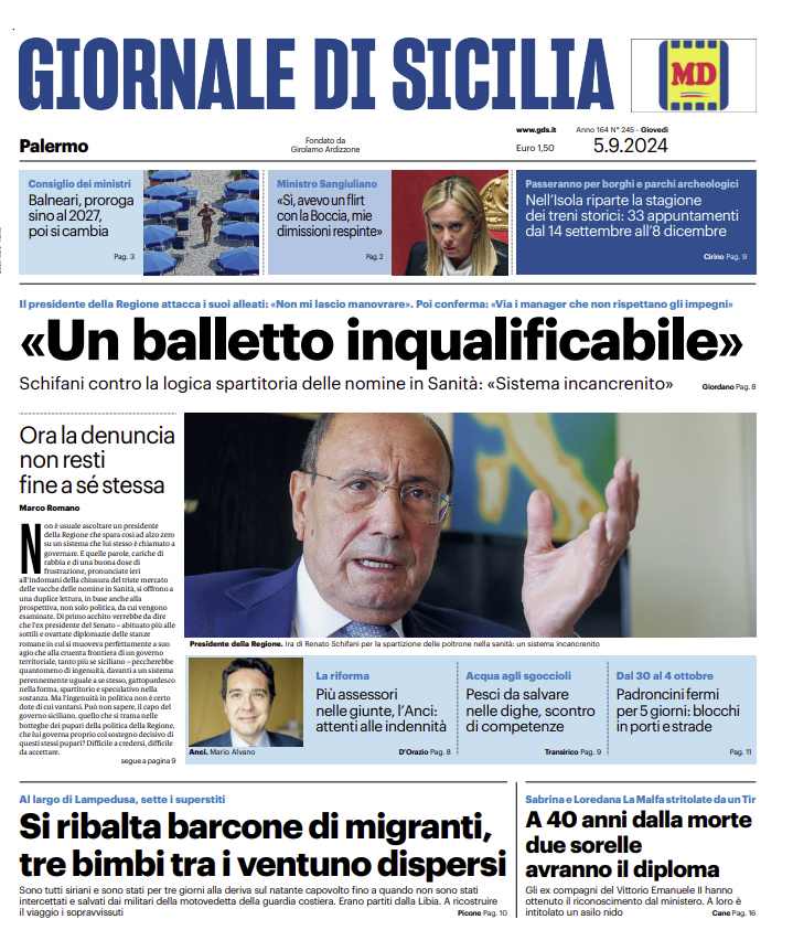 L’edizione odierna de Il Giornale di Sicilia dedica un titolo in prima pagina alla reazione di Schifani sula spartizione in Sanità.