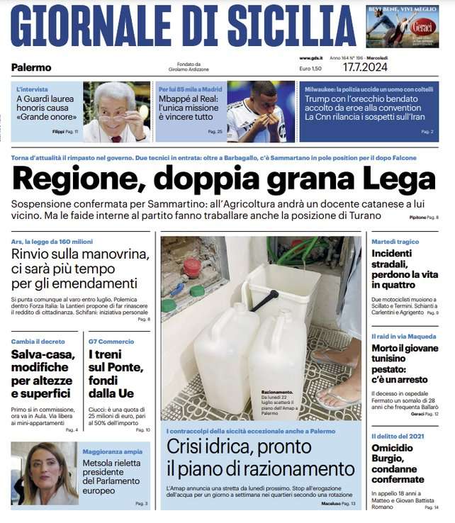 Prima pagina Giornale di Sicilia: “Crisi idrica, pronto il piano di razionamento”