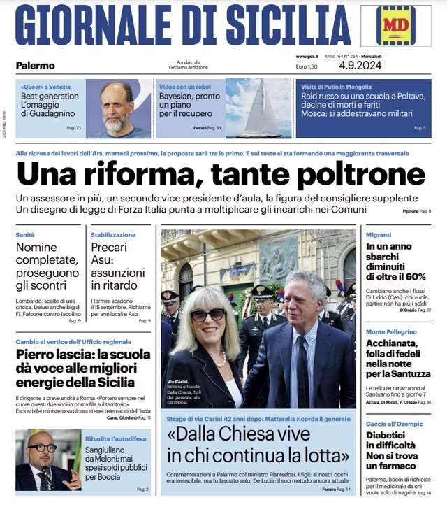 L’edizione odierna de Il Giornale di Sicilia dedica un titolo in prima pagina all’anniversario di Dalla Chiesa.
