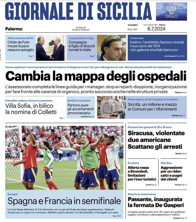 L’edizione odierna de Il Giornale di Sicilia dedica la prima pagina ad Euro 2024 con Spagna a Francia che volano in semifinale.