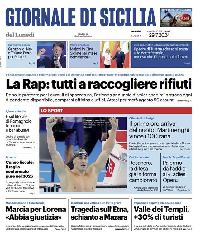 L’edizione odierna de Il Giornale di Sicilia dedica un titolo in prima pagina alle olimpiadi e al primo oro per l’Italia nel nuoto.