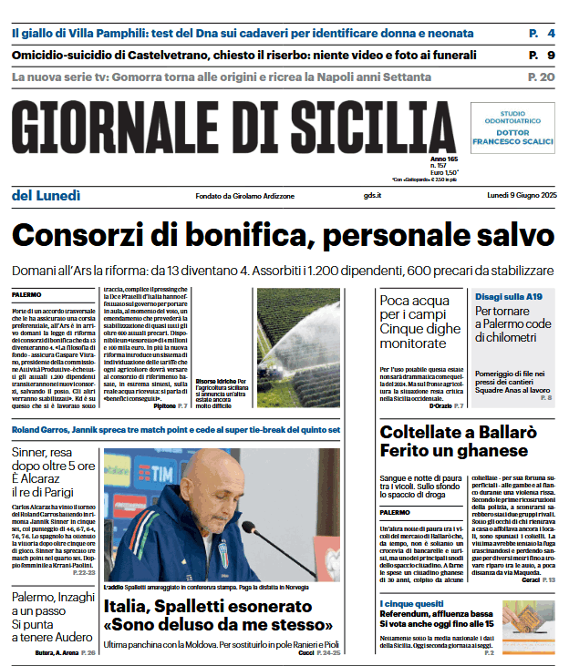 Prima pagina Giornale di Sicilia: “Italia, Spalletti esonerato «Sono deluso da me stesso»”