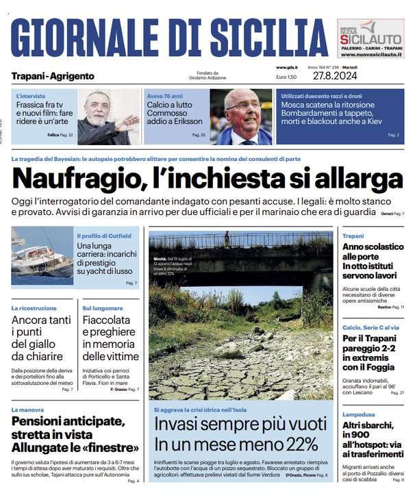 L’edizione odierna de Il Giornale di Sicilia dedica un titolo in prima pagina al Bayesian e l’inchiesta in corso per il naufragio.