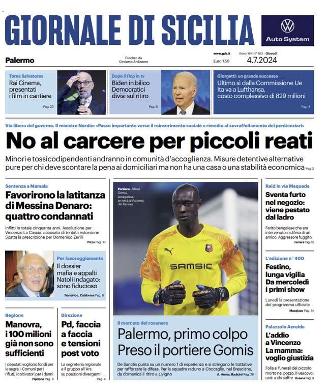 Prima pagina Giornale di Sicilia: “Palermo, primo colpo preso il portiere Gomis”