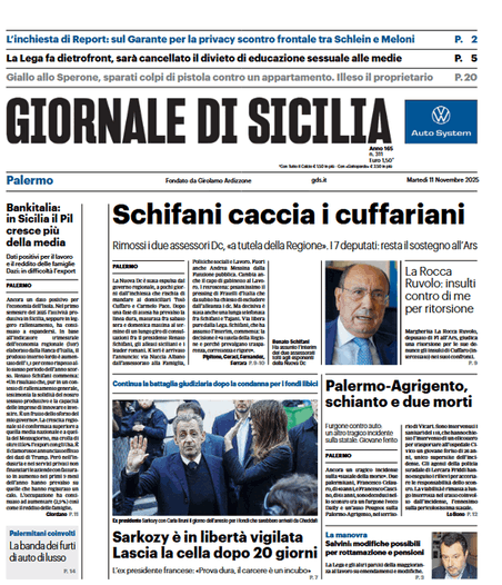 Prima pagina Giornale di Sicilia: “Schifani caccia i cuffariani”