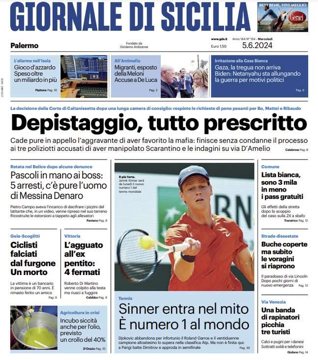 L’edizione odierna de “Il Giornale di Sicilia” dedica la prima pagina a Sinner primo negli Atp.