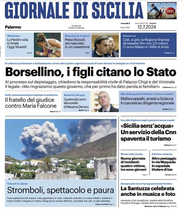 L’edizione odierna de Il Giornale di Sicilia dedica la prima pagina all’eruzione dello Stromboli.