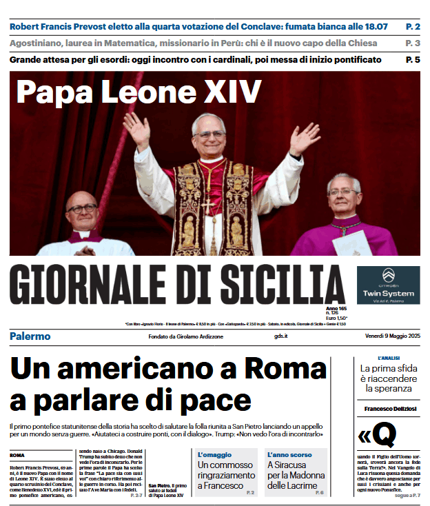 Prime pagine Prima pagina Giornale di Sicilia: “Un americano a Roma a parlare di pace” Segui Ilovepalermocalcio su Google News Redazione Ilovepalermocalcio Maggio 9, 2025 Eletto il nuovo Papa Continue Reading Previous Prima pagina Corriere dello Sport: “Yamala”Next Prima pagina Repubblica Palermo: “La Chiesa siciliana accoglie Leone”