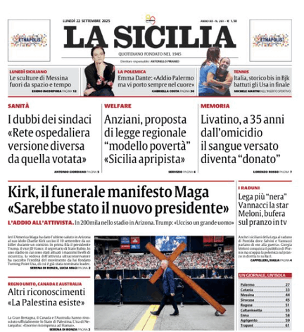 Prime pagine Prima pagina La Sicilia: “Altri riconoscimenti per la Palestina” Segui Ilovepalermocalcio su Google News Redazione Ilovepalermocalcio Settembre 22, 2025 Politica internazionale Continue Reading Previous Prima pagina Tuttosport: “Nadia, bella come un sogno”Next Prima pagina Tuttosport: “Toro e Cairo da nascondersi”