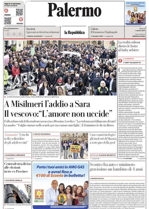 Prima pagina Repubblica Palermo: “A Misilmeri l’addio a Sara. Il vescovo: L’amore non uccide”