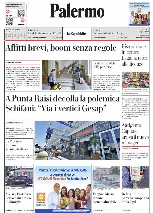 Prima pagina Repubblica Palermo: “A Punta Raisi decolla la polemica. Schifani: Via i vertici Gesap”