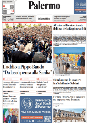 Prime pagine Prima pagina Repubblica Palermo: “Alt a tornelli e staccionate il diktat della Regione ai lidi” Segui Ilovepalermocalcio su Google News Redazione Ilovepalermocalcio Agosto 21, 2025 L’addio a Pippo Baudo “Da lassù pensa alla Sicilia” Continue Reading Previous Prima pagina Corriere dello Sport: “Kolo: 70 milioni”Next Prima pagina Giornale di Sicilia: “L’ultimo saluto a Pippo «Una stella pure in cielo»”