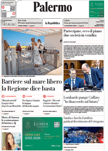 Prima pagina Repubblica Palermo: “Barriere sul mare libero la Regione dice basta”