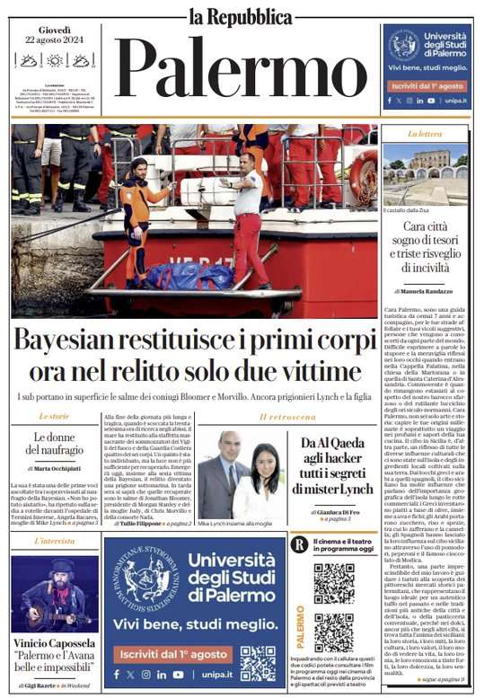 Prima pagina Repubblica Palermo: “Bayesan restituisce i primi corpi. Ora nel relitto solo due vittime”