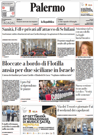 Prime pagine Prima pagina Repubblica Palermo: “Bloccate a bordo di Flotilla. Ansia per due siciliane in Israele” Segui Ilovepalermocalcio su Google News Redazione Ilovepalermocalcio Ottobre 9, 2025 Sanità, FdI e privati all’attacco di Schifani Continue Reading Previous Prima pagina Gazzetta dello Sport: “La festa del volley”Next Prima pagina Giornale di Sicilia: “Manovra, cammino in salita”