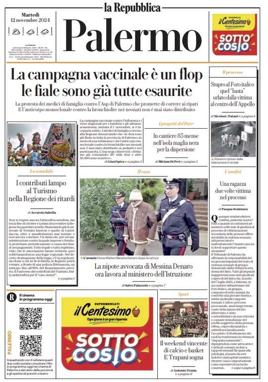 Prima pagina Repubblica Palermo: “Campagna vaccinale un flop”