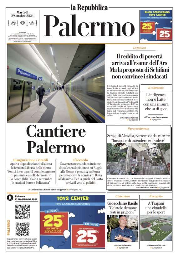 Prime pagine Prima pagina Repubblica Palermo: “Cantiere Palermo” Segui Ilovepalermocalcio su Google News Redazione Ilovepalermocalcio Ottobre 29, 2024 L’edizione odierna de La Repubblica Palermo dedica un titolo in prima pagina all’apertura della fermata Libertà. Continue Reading Previous Prima pagina Tuttosport: “La meglio Juventus”Next Prima pagina Giornale di Sicilia: “I rosa a Mantova per continuare a scalare la vetta”