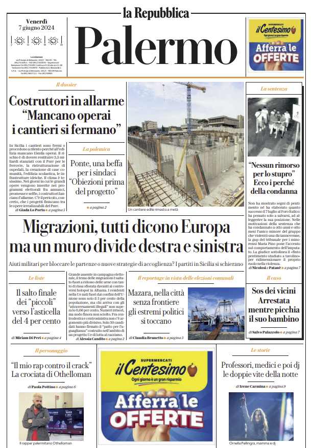Prima pagina Repubblica Palermo: “Costruttori in allarme: mancano operai, i cantieri si fermano”