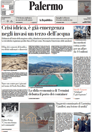 Prima pagina Repubblica Palermo: Crisi idrica, è già emergenza. Negli invasi un terzo dell’acqua