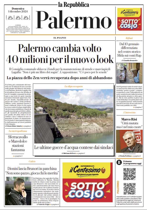 Prima pagina Repubblica Palermo: “Dionisi lascia Brunori in panchina: «Nom sono pazzo, gioca chi merita»”
