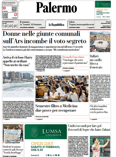 Prime pagine Prima pagina Repubblica Palermo: “Donne nelle giunte comunali” Segui Ilovepalermocalcio su Google News Redazione Ilovepalermocalcio Gennaio 20, 2026 Sull’Ars incombe il voto segreto Continue Reading Previous Prima pagina Gazzetta dello Sport: “Febbre a 90”Next Prima pagina Tuttosport: “Chivu contro i più forti”