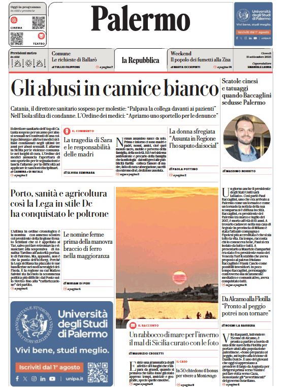 Prime pagine Prima pagina Repubblica Palermo: “Gli abusi in camice bianco” Segui Ilovepalermocalcio su Google News Redazione Ilovepalermocalcio Settembre 11, 2025 Da Alcamo alla Flotilla “Pronto al peggio potrei non tornare” Continue Reading Previous Prima pagina Corriere dello Sport: “Palermo, altro colpo”Next Prima pagina Giornale di Sicilia: “Addio a Baccaglini, per 4 mesi fu presidente del Palermo”
