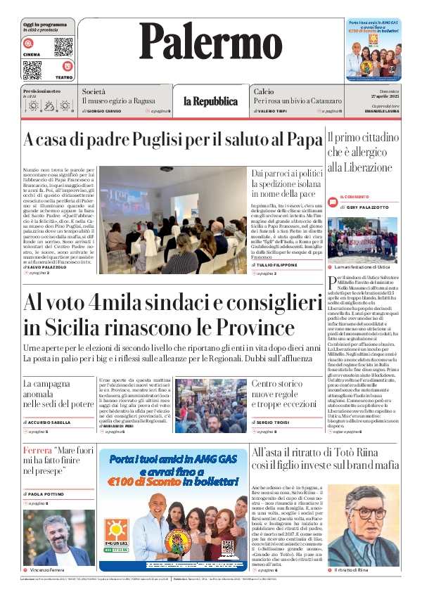Prime pagine Prima pagina Repubblica Palermo: “In Sicilia rinascono le Province” Segui Ilovepalermocalcio su Google News Redazione Ilovepalermocalcio Aprile 27, 2025 Si vota Continue Reading Previous Prima pagina Tuttosport: “Champions e Tonali”Next Prima pagina Corriere dello Sport: “Una manita”