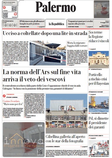 Prima pagina Repubblica Palermo: “La norma dell’Ars sul fine vita, arriva il veto dei vescovi”