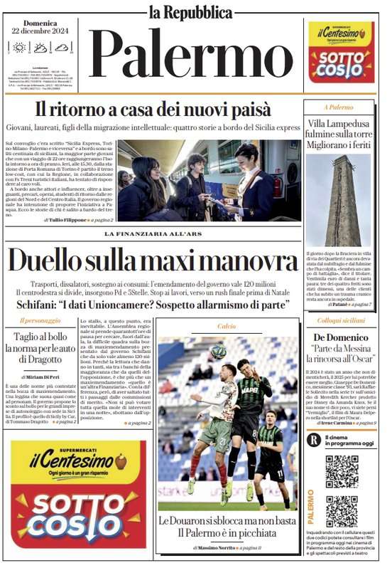 L’edizione odierna de “La Repubblica Palermo” dedica un titolo in prima pagina al Palermo sconfitto dal Sassuolo.