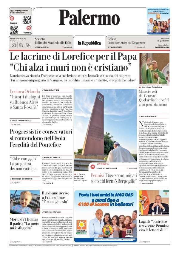 Prime pagine Prima pagina Repubblica Palermo: “Le lacrime di Lorefice per il Papa” Segui Ilovepalermocalcio su Google News Redazione Ilovepalermocalcio Aprile 23, 2025 Anche Palermo piange la scomparsa del Papa Continue Reading Previous Prima pagina Corriere dello Sport: “Tutto da perdere”Next Prima pagina Gazzetta dello Sport: “Milan, vinco con te”
