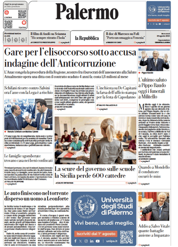 Prime pagine Prima pagina Repubblica Palermo: “L’ultimo saluto a Pippo Baudo” Segui Ilovepalermocalcio su Google News Redazione Ilovepalermocalcio Agosto 20, 2025 La scure del governo sulle scuole la Sicilia perde 600 cattedre Continue Reading Previous Prima pagina Corriere dello Sport: “De Zerbi caccia Rabiot”Next Prima pagina Gazzetta dello Sport: “Krstovic all’Atalanta”