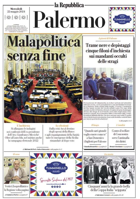 Prime pagine Prima pagina Repubblica Palermo: “Malapolitica senza fine” Segui Ilovepalermocalcio su Google News Redazione Ilovepalermocalcio Maggio 22, 2024 L’edizione odierna de “La Repubblica – Palermo” si sofferma sulla malapolitica in Sicilia. Continue Reading Previous Prima pagina Tuttosport: “Yildiz 10 e lode”Next Prima pagina Giornale di Sicilia: “La memoria oltre la retorica”