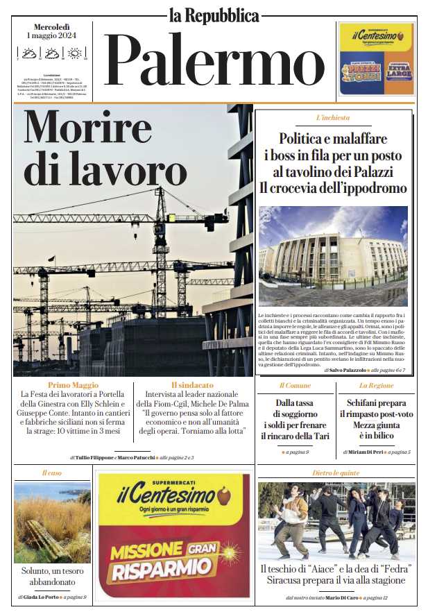 L’edizione odierna de “La Repubblica – Palermo” dedica la prima pagina al Primo Maggio.
