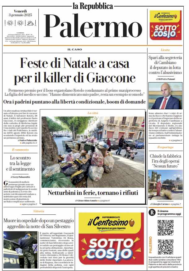 Prima pagina Repubblica Palermo: “Netturbini in ferie, tornano i rifiuti”