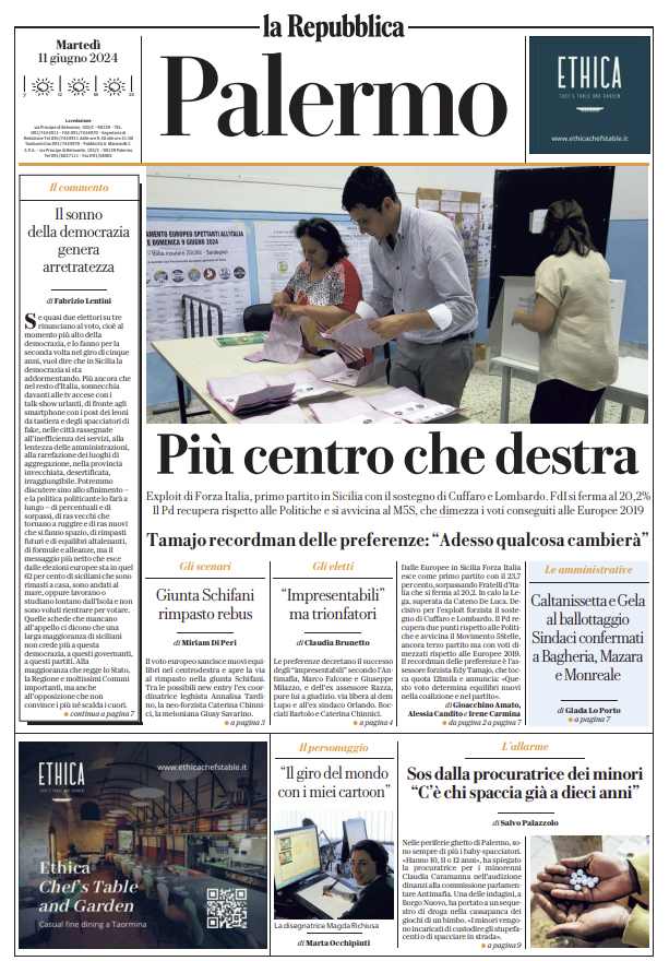 Prime pagine Prima pagina Repubblica Palermo: “Più centro che destra” Segui Ilovepalermocalcio su Google News Redazione Ilovepalermocalcio Giugno 11, 2024 L’edizione odierna de “La Repubblica – Palermo” dedica la prima pagina ai risultati delle Europee. Continue Reading Previous Prima pagina Tuttosport: “Trezeguet, lezioni di Juve”Next Prima pagina Giornale di Sicilia: “In Germania sale la febbre per gli azzurri”