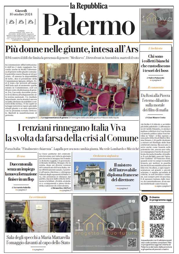 Prima pagina Repubblica Palermo: “Più donne nelle giunte. Intera all’Ars”