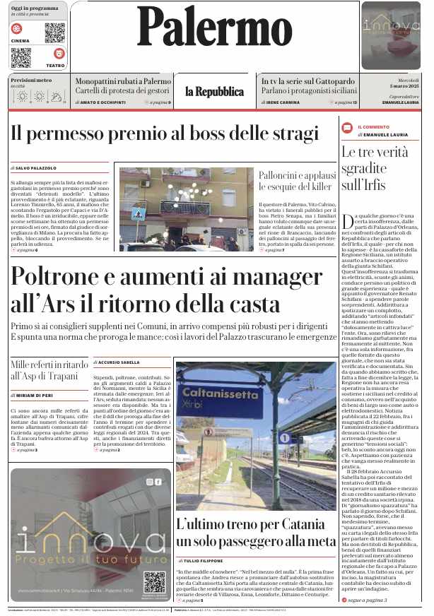Prima pagina Repubblica Palermo: “Poltrone e aumenti ai manager, all’Ars il ritorno della casta”
