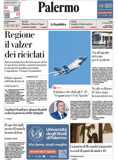 Prime pagine Prima pagina Repubblica Palermo: “Regione il valzer dei riciclati” Segui Ilovepalermocalcio su Google News Redazione Ilovepalermocalcio Settembre 13, 2025 Il sindaco che sfida gli F-35 “Trapani non è Fort Apache” Continue Reading Previous Prima pagina Corriere dello Sport: “Affari suoi”Next Prima pagina Tuttosport: “Toro, lo sai come si fa un gol?”