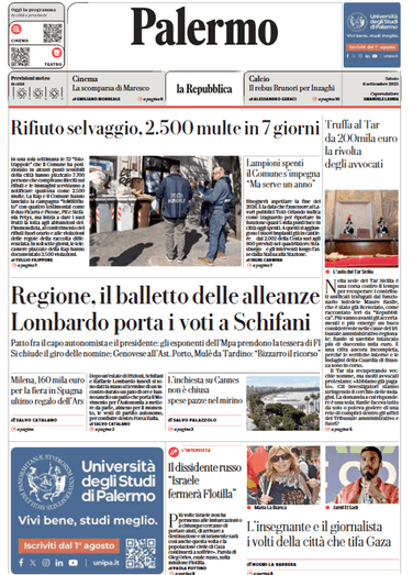 Prime pagine Prima pagina Repubblica Palermo: “Rifiuto selvaggio, 2.500 multe in 7 giorni” Segui Ilovepalermocalcio su Google News Redazione Ilovepalermocalcio Settembre 6, 2025 Regione, il balletto delle alleanze Lombardo porta i voti a Schifani Continue Reading Previous Prima pagina Tuttosport: “«Brasile, non vediamo l’ora»”Next Prima pagina Corriere dello Sport: “Goleada”