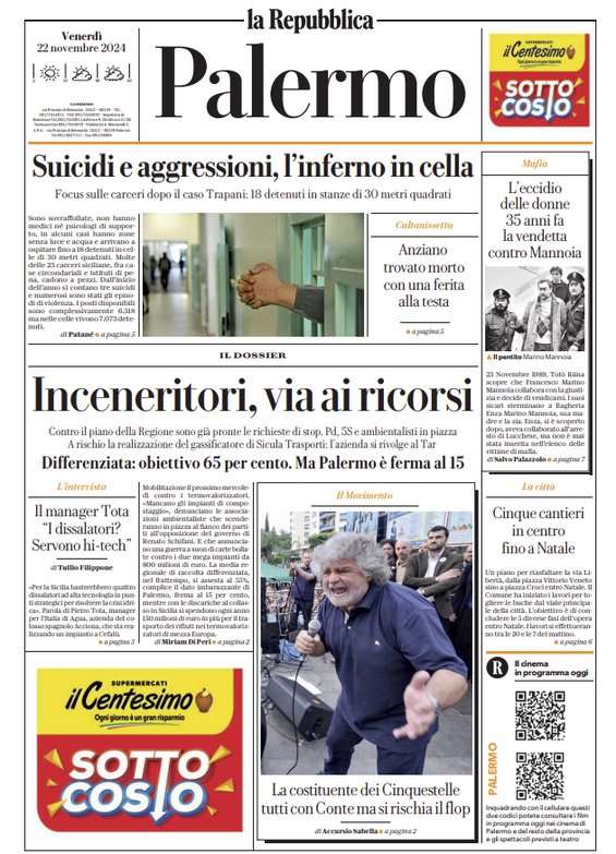 Prima pagina Repubblica Palermo: “Suicidi e aggressioni, l’inferno in cella”