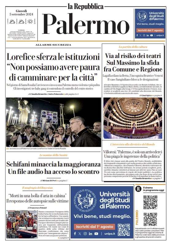 Prima pagina Repubblica Palermo: “Sul Massimo la sfida fra Comune e Regione”
