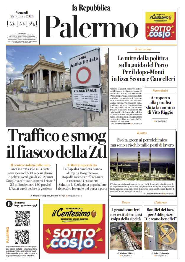 Prima pagina Repubblica Palermo: “Traffico e smog, il fiasco della Ztl”