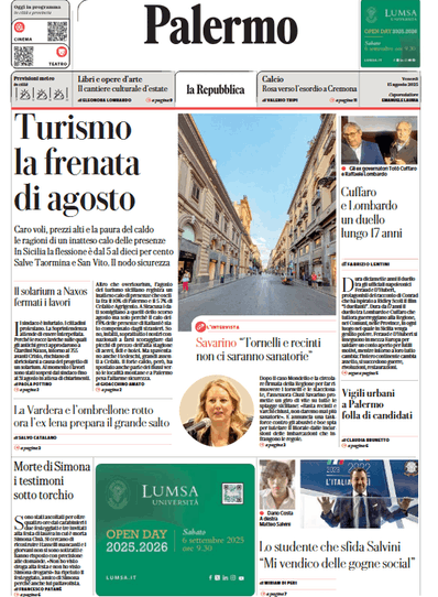 Prime pagine Prima pagina Repubblica Palermo: “Turismo la frenata di agosto” Segui Ilovepalermocalcio su Google News Redazione Ilovepalermocalcio Agosto 15, 2025 In Sicilia la flessione è dal 5 al dieci per cento Continue Reading Previous Prima pagina Tuttosport: “«Maldini deve essere uomo della Nazionale per aiutare Gattuso»”Next Prima pagina Tuttosport: “Giletti: «Così Palermo sogna»”